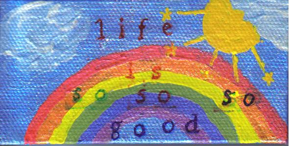 For kicks (and because Joan wants one) I looked up “life is so so so good” on the USPTO Web site. Turns out no individual, no brand, no company owns that combo of words. Therefore I officially hereby claim and declare copyright of “life is so so so good” as MINE–ours actually! I hereby give my readers permission to go crazy with puffy paint, t-shirts and deliriously create!