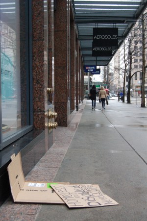 This was the first photo I shot one morning: An abandoned handwritten sign that said “Homeless and disabled. Need money for bus.”